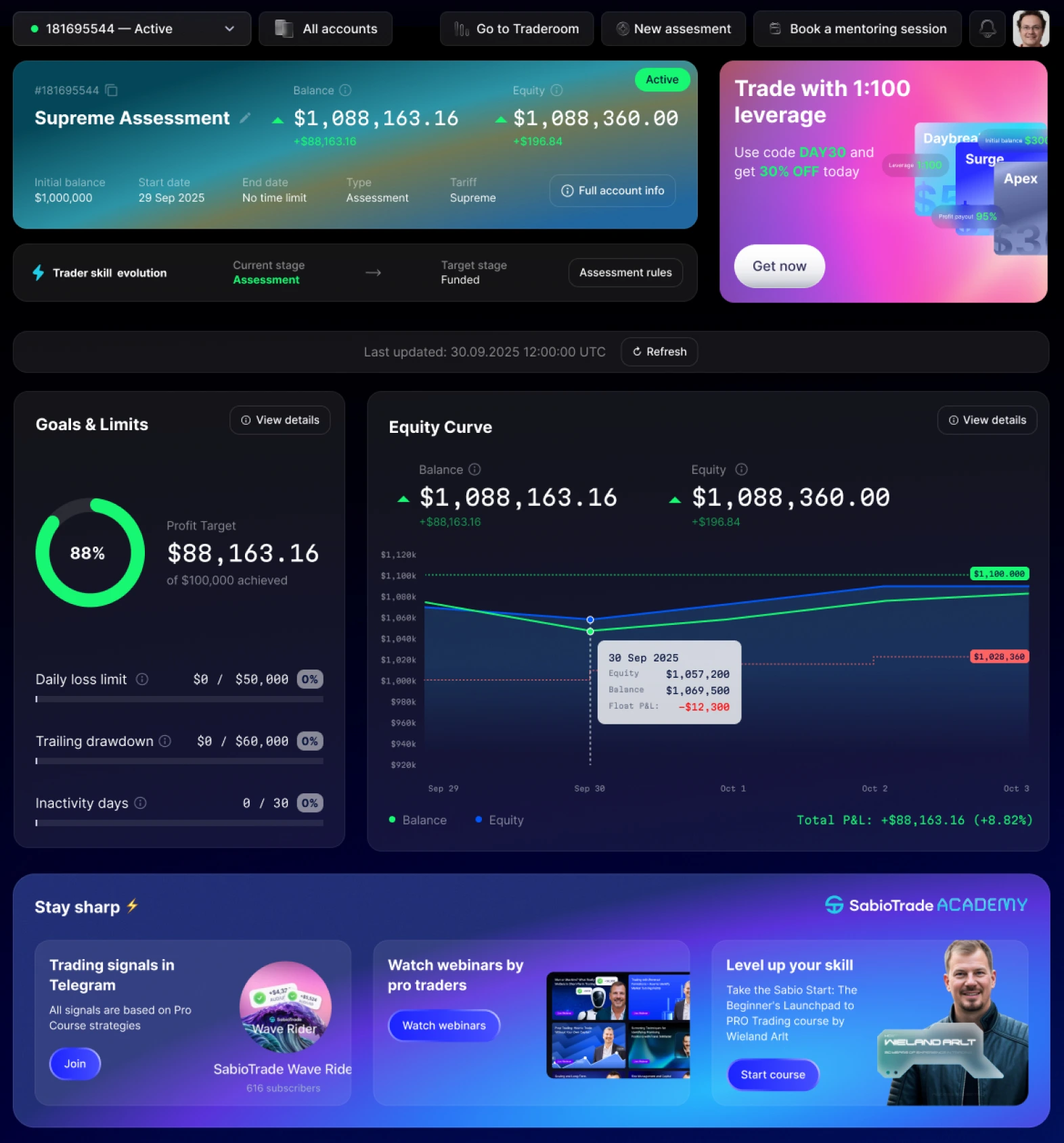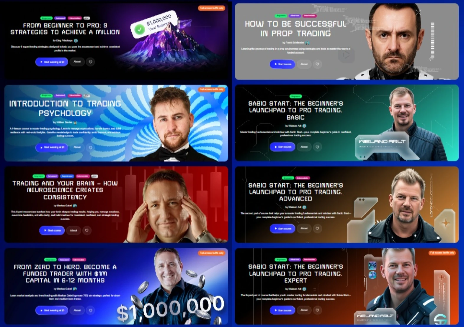 Sabio Trade combines features that make it a fit for all kinds of traders: simple 1-step assessment and free education for beginners, mentorship for developing traders, and extra-large funding for pros.