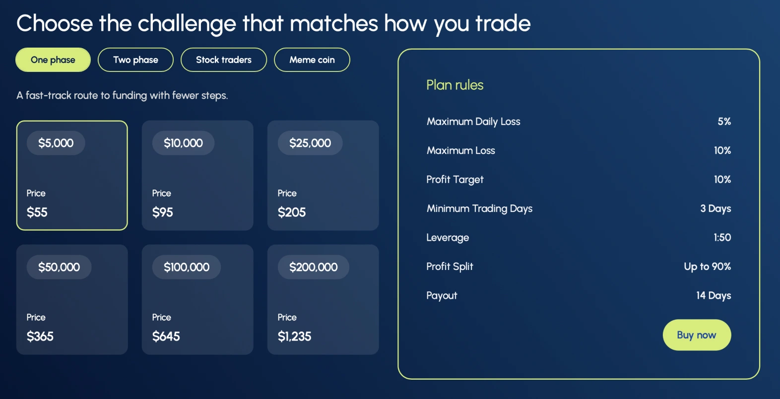 FundedPrime focuses on risk-takers who want flexibility. Along with standard 1- and 2-step plans, it also offers innovative challenges tailored specifically for stock traders and meme coin traders.
