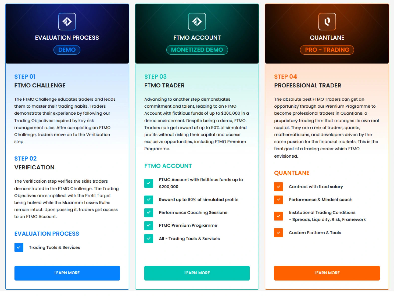 Each firm structures its challenge differently, but most fall into three main types: 1-step, 2-step, and instant funding programs.