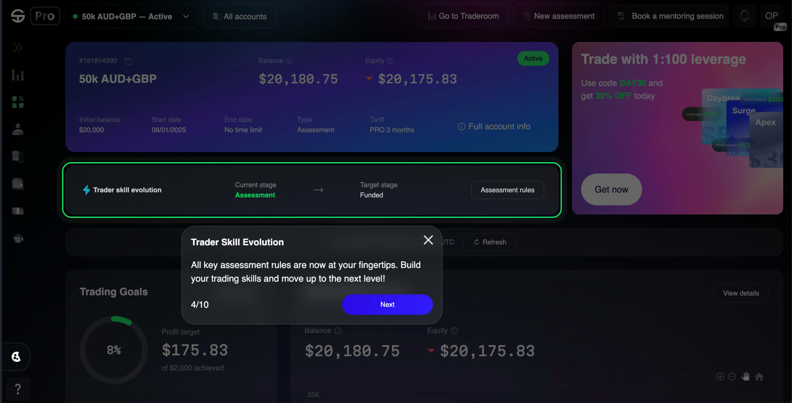 The Trader Skill Evolution widget shows exactly where you are on your trading journey and how close you are to reaching the next level.