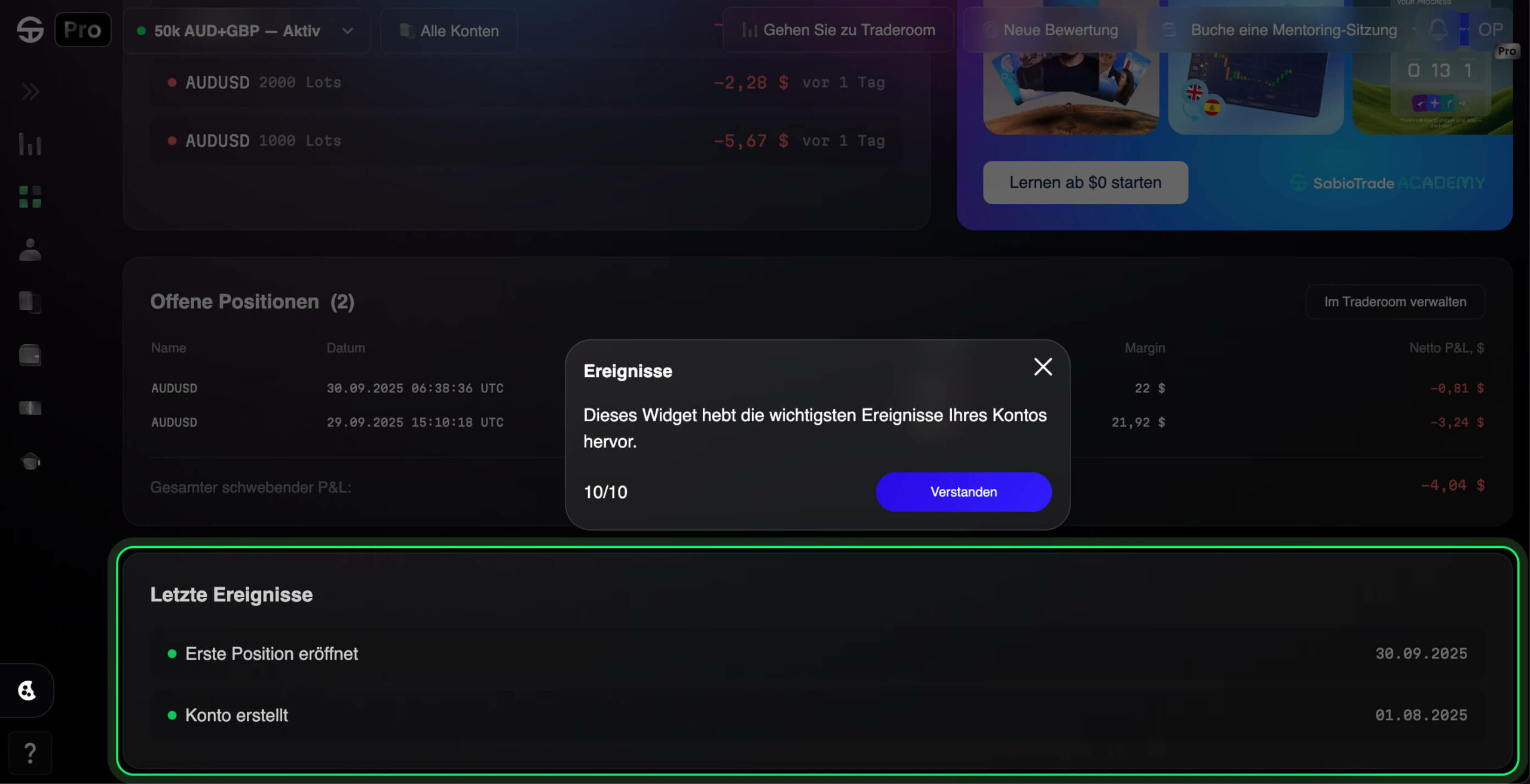 Das Widget für letzte Ereignisse fungiert wie eine persönliche Timeline deines Kontos, zeichnet wichtige Meilensteine wie Kontoerstellung, ersten Trade und jeden weiteren Schritt auf.