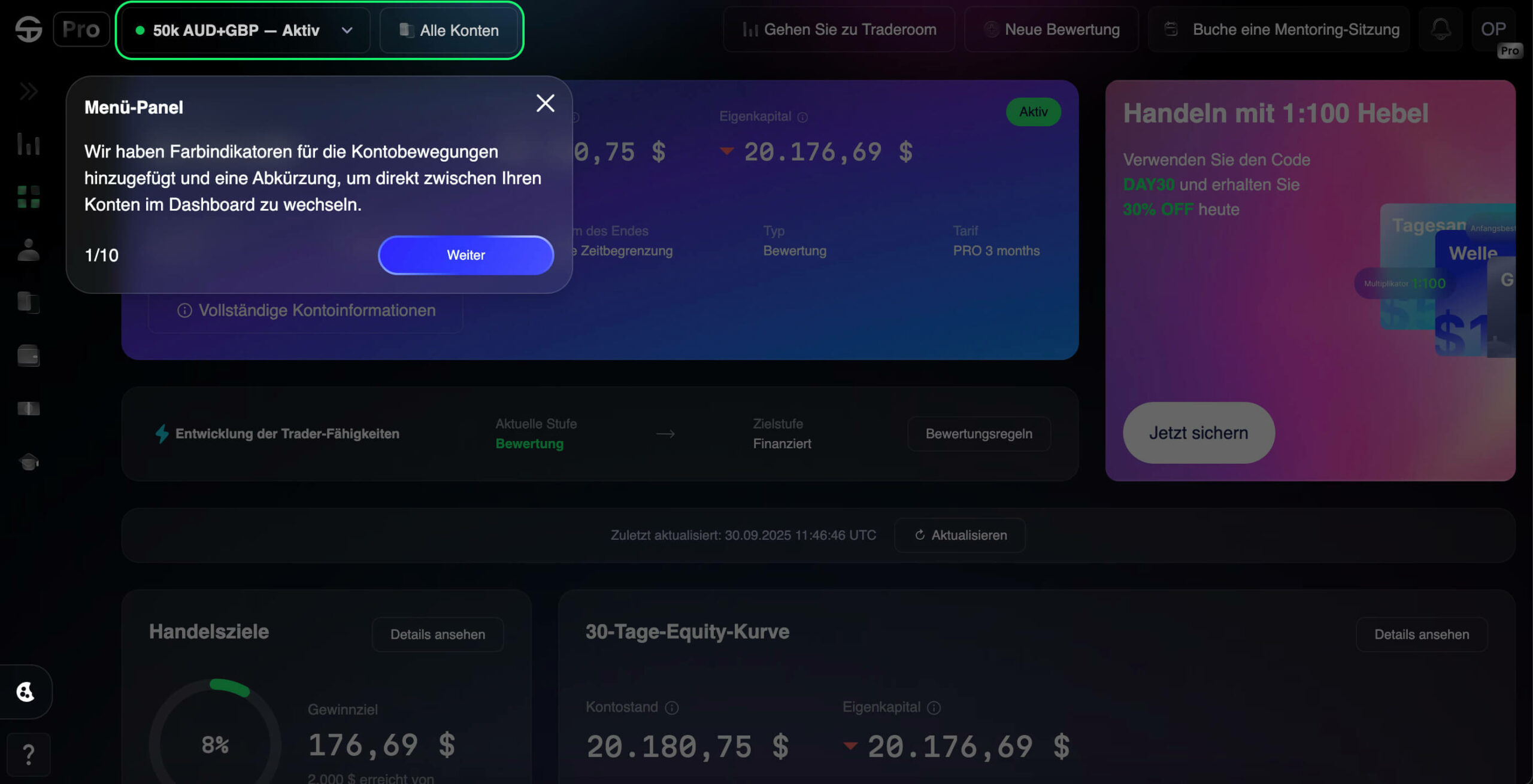 Das neue Dashboard ist übersichtlich, benutzerfreundlich und bietet dir einen klaren Überblick über deine Situation. Betrachte es als dein persönliches Trading-Kontrollzentrum, das wir gebaut haben, um dein Leben komfortabler zu machen.