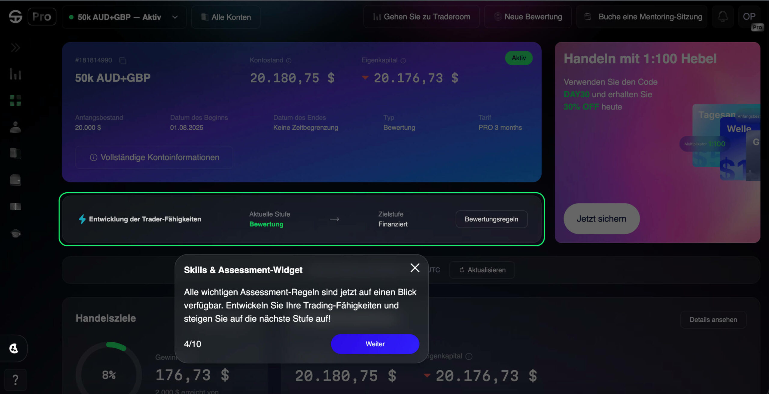 Das Trader-Fähigkeiten-Widget zeigt genau, wo du auf deinem Trading-Weg stehst und wie nah du dem nächsten Level bist.