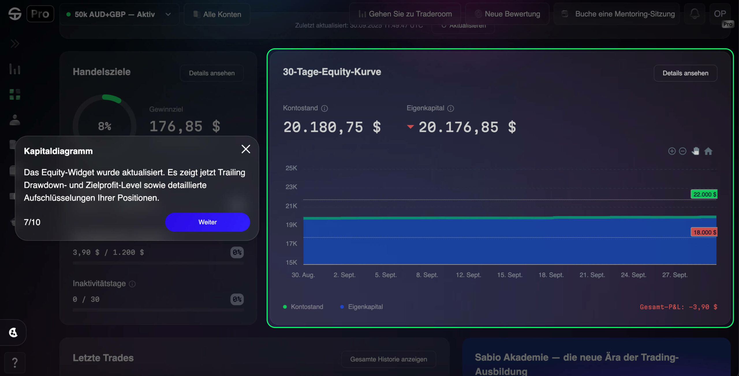 Deshalb haben wir das Sabio Trading Dashboard neu gestaltet — damit das Verfolgen deines Tradings so natürlich (und motivierend) wie möglich ist. Wir sind sehr stolz auf das Ergebnis und hoffen, dass es dir viel Freude bereitet!