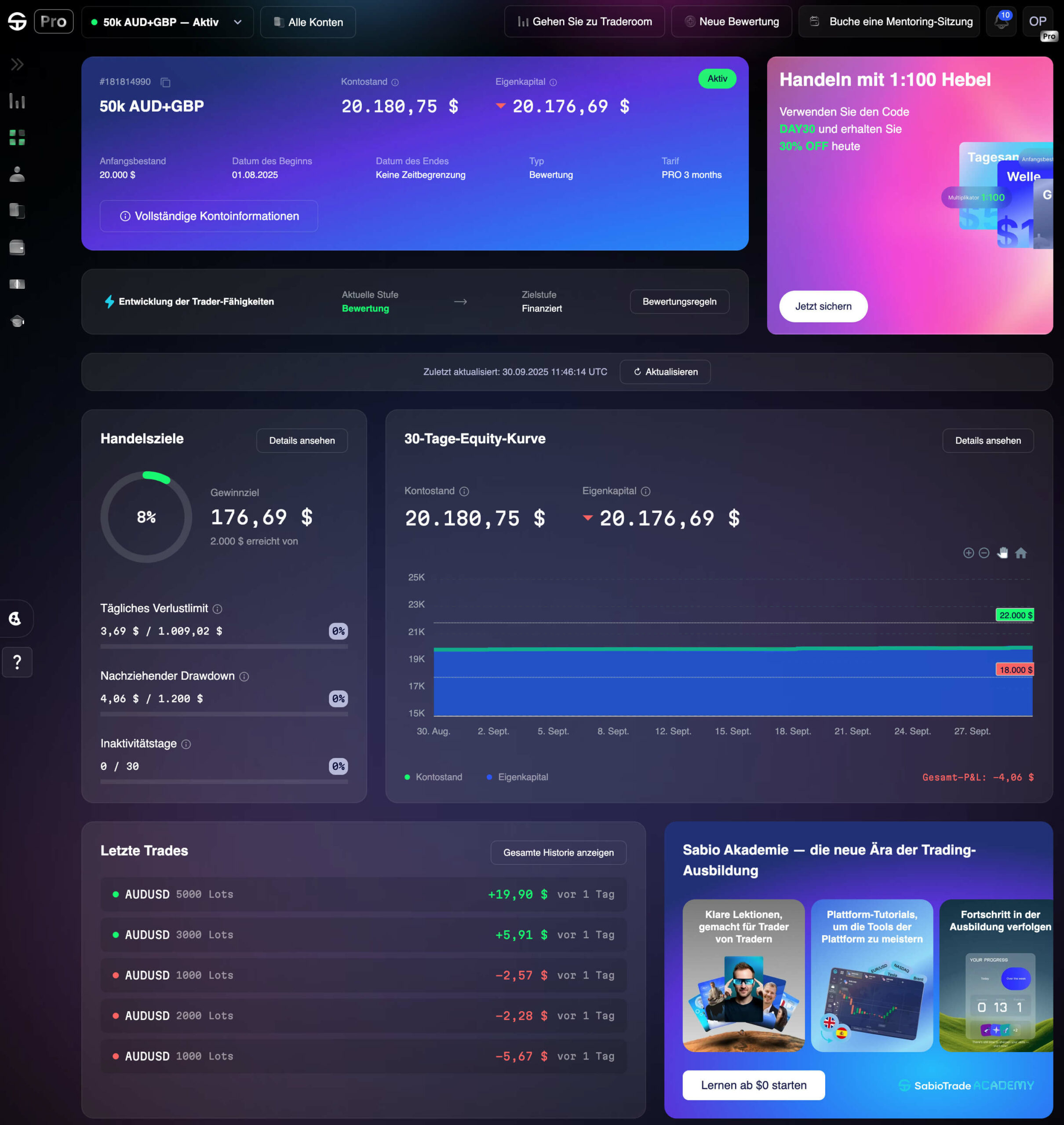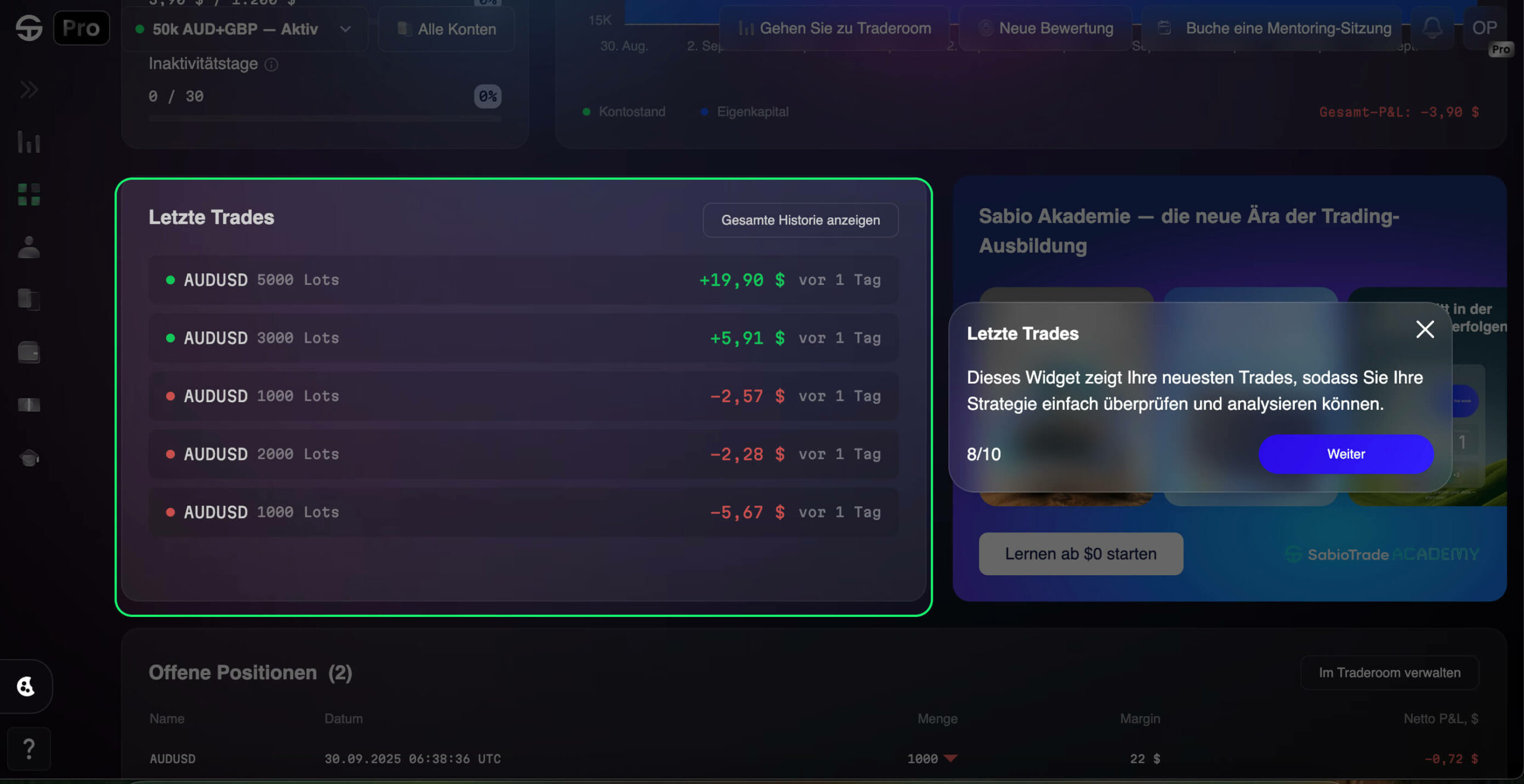 Wusstest du, dass wir eine Sabio Academy haben, in der Trader von den Grundlagen bis zu fortgeschrittenen Strategien lernen. Das Empfehlungs-Widget bringt dieses Wissen direkt in dein Dashboard.