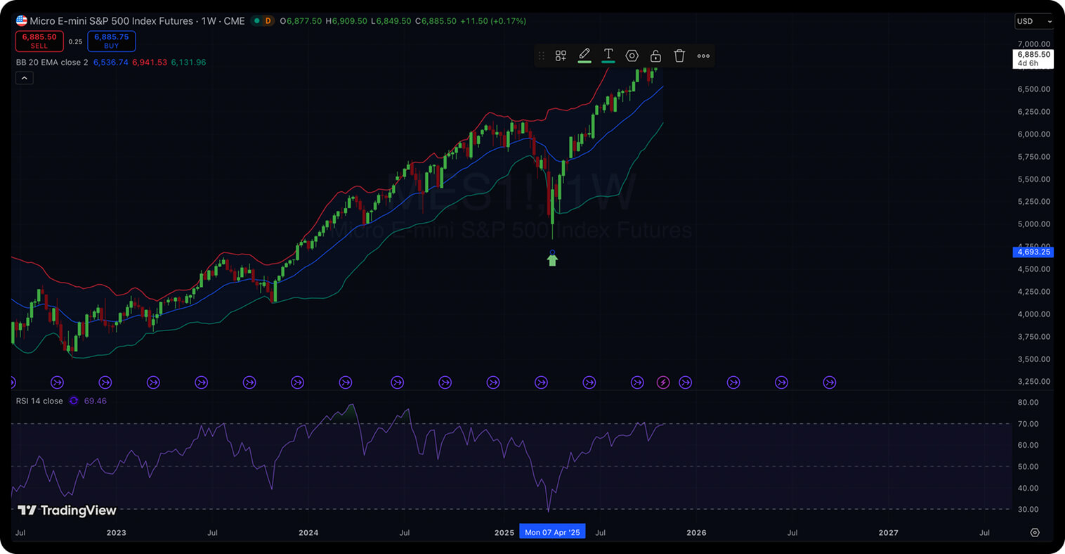 Seguendo l’analisi tecnica, la strategia è di comprare micro e-mini S&P 500 dopo che i prezzi rimbalzano dalla Bollinger Band inferiore e l’RSI rimbalza dopo aver toccato livelli sotto 30.