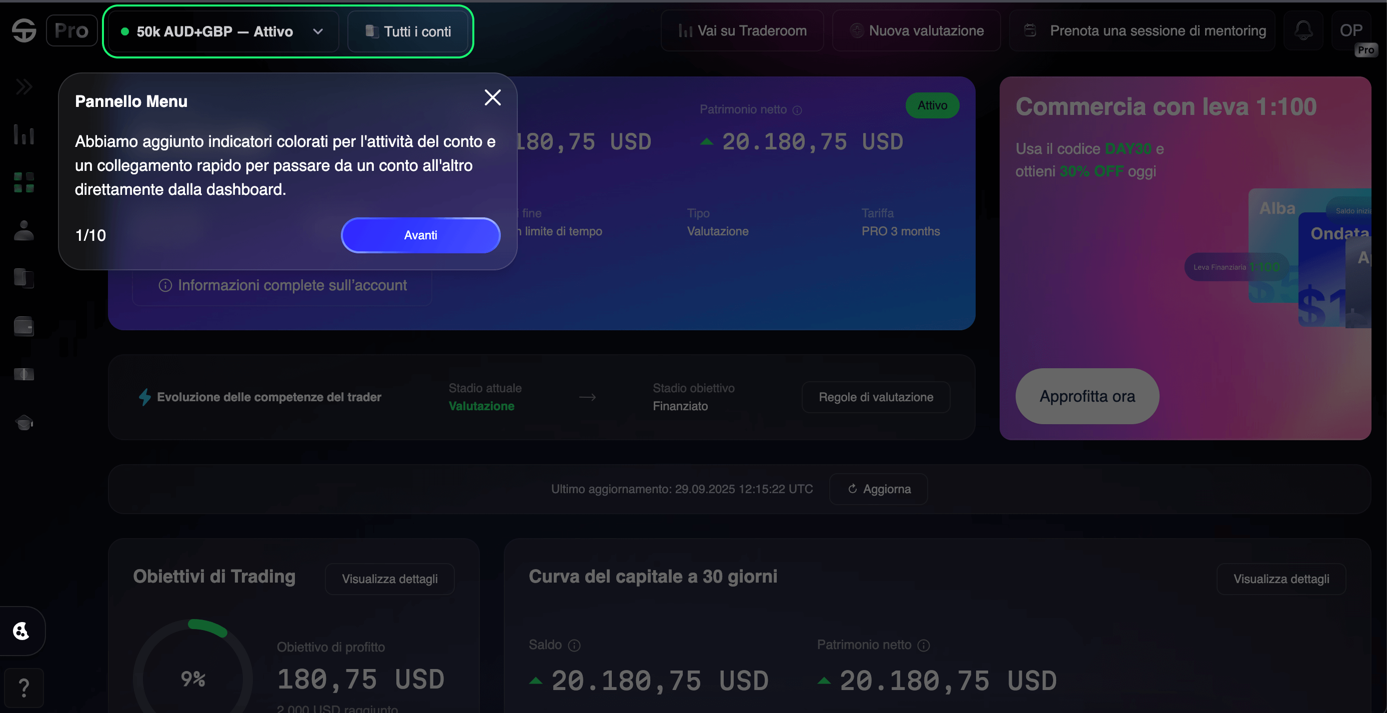 Il nuovo dashboard è pulito, facile da usare e ti offre una visione chiara della tua situazione. Pensalo come il tuo centro di comando personale per il trading, costruito per rendere la tua vita più comoda.