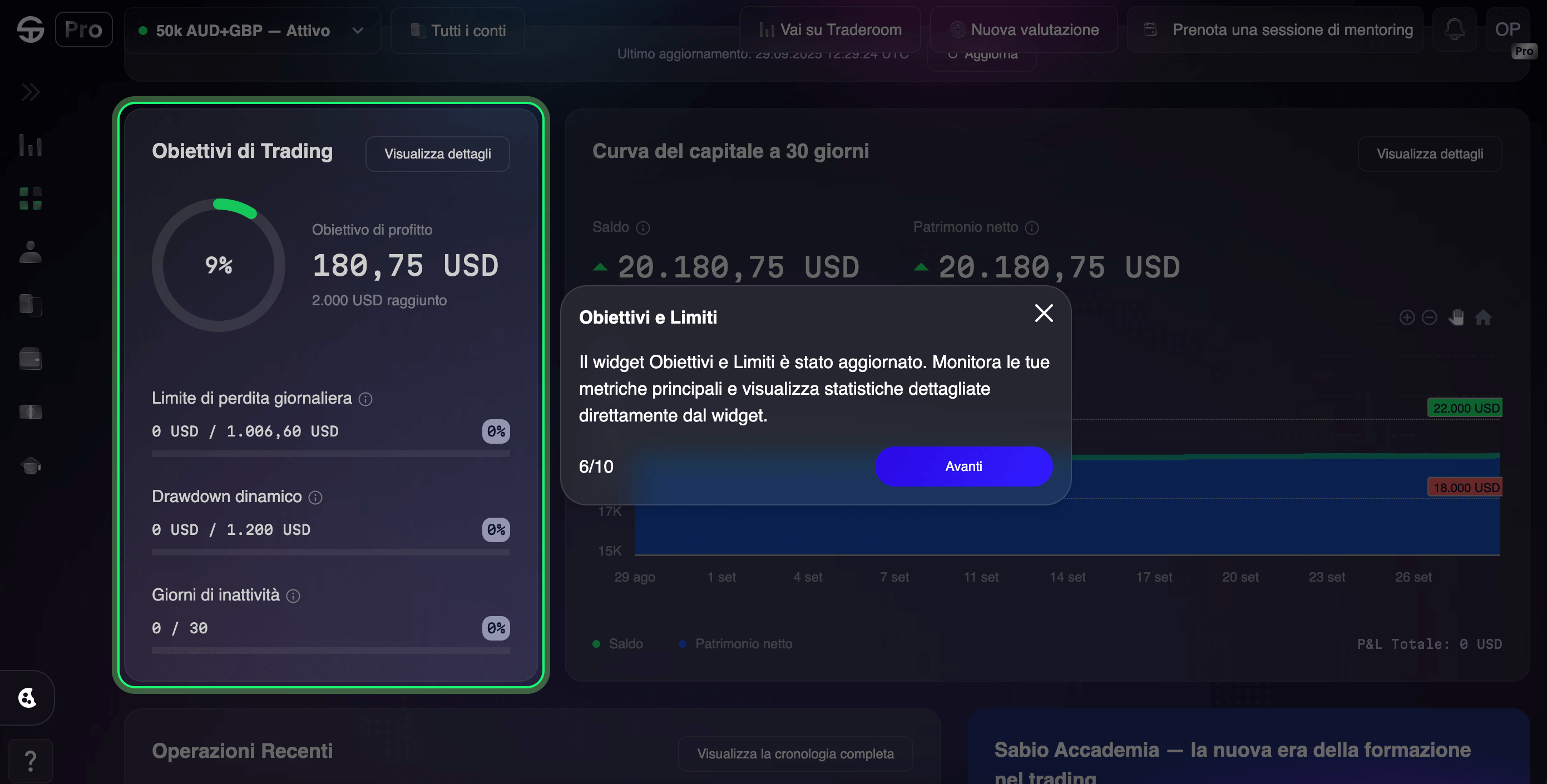 Il Widget di Evoluzione delle Competenze del Trader mostra esattamente dove sei nel tuo percorso di trading e quanto sei vicino a raggiungere il livello successivo.