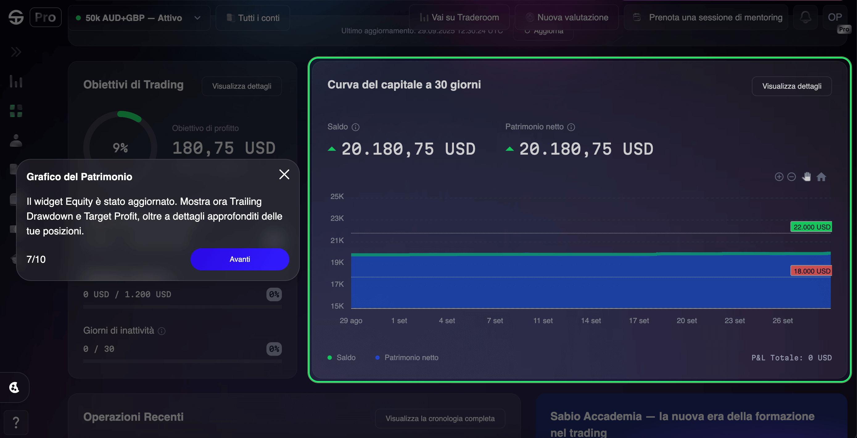 Se il Grafico di Guadagno e Rischio è il tuo allenatore, il Widget di Equity è il tuo diario. Tiene traccia dettagliata di come il tuo conto ha performato nel tempo.