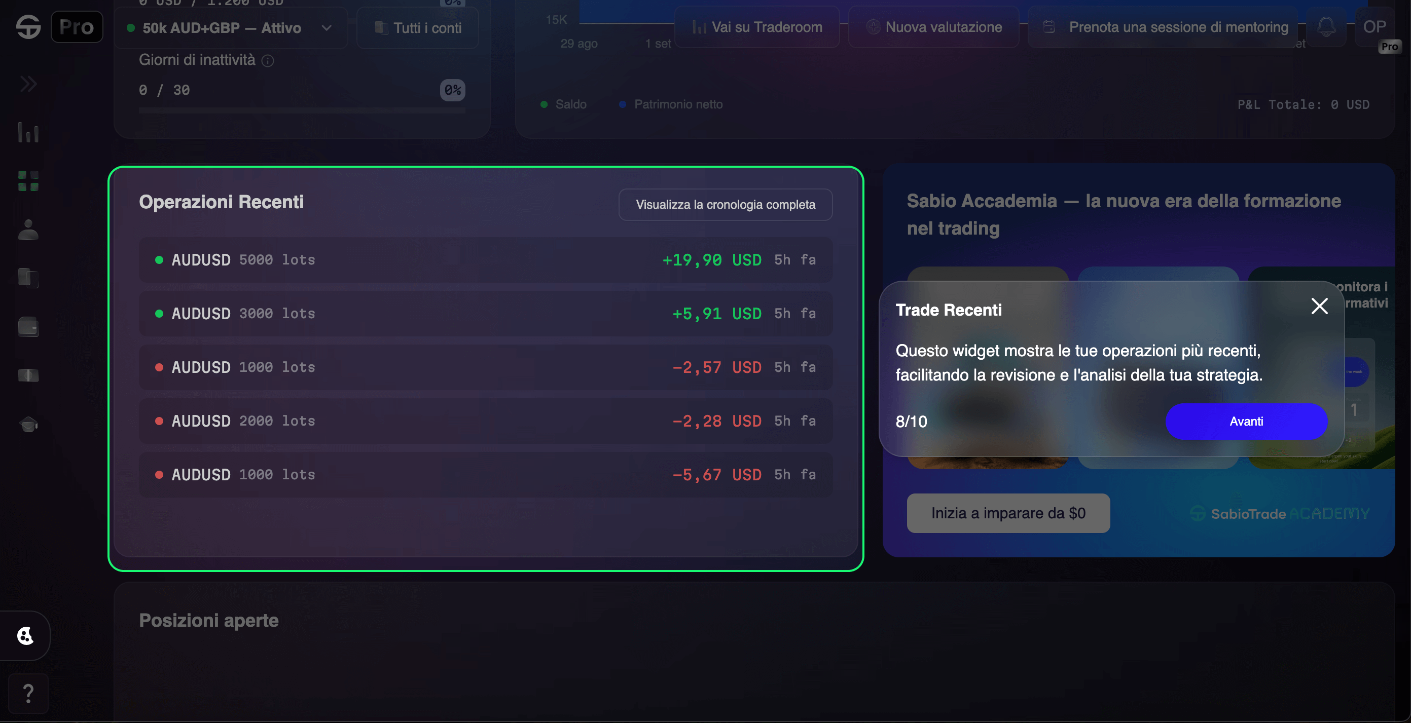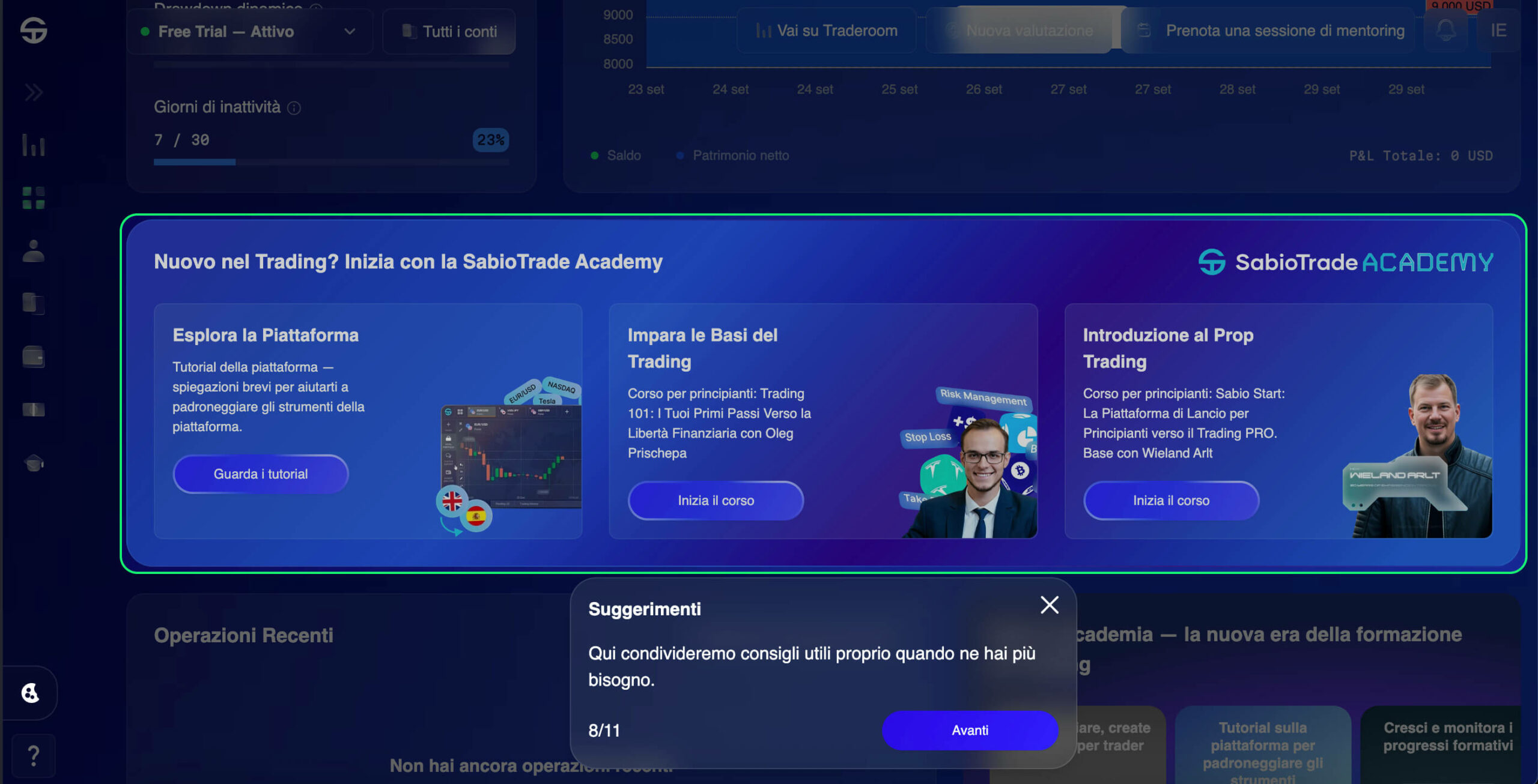 Nel caso non lo sapessi, abbiamo una Sabio Academy dove insegniamo ai trader dalle basi fino alle strategie avanzate. Il Widget di Suggerimenti porta tutto questo direttamente sul tuo dashboard.